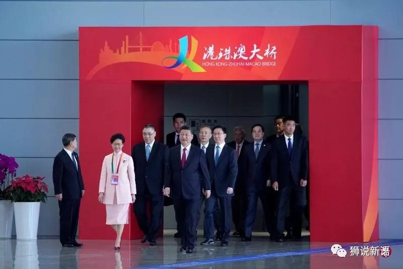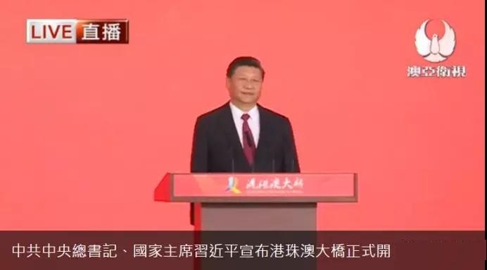 连接香港、珠海、澳门的港珠澳大桥今早举行通车仪式,中共总书记、中国国家主席习近平于2018年10月23日星期二上午10时在广东省珠海口岸旅检大楼宣布港珠澳大桥正式开通,随后参观大桥。