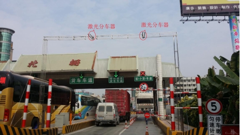 图1 广东广深高速北栅站计重收费车道--激光分车器顶装实景