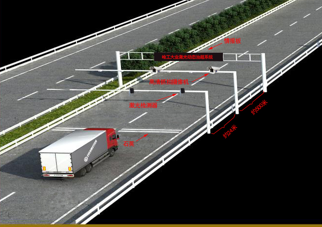系统集动态称重、激光交通情况监测、高清车牌识别于一体。在主要公路桥梁超限车辆密集路段上安装本系统,可在不影响车辆正常行驶的情况下,自动完成对经过该断面的所有车辆的重量、车型、车牌、车速的计算以及交通流量调查。系统快速检测出超重车辆,同时可以看清前排司乘人员的面部特征,增强证据的说服力,并通过配套的电子显示牌及道路标线、标志引导超限车辆进入服务区治超站接受进一步复查和处理,而不影响正常交通。