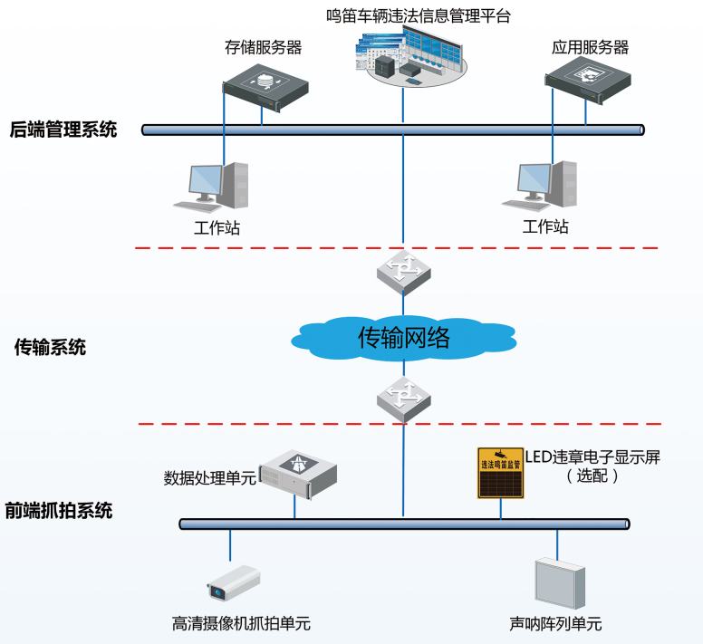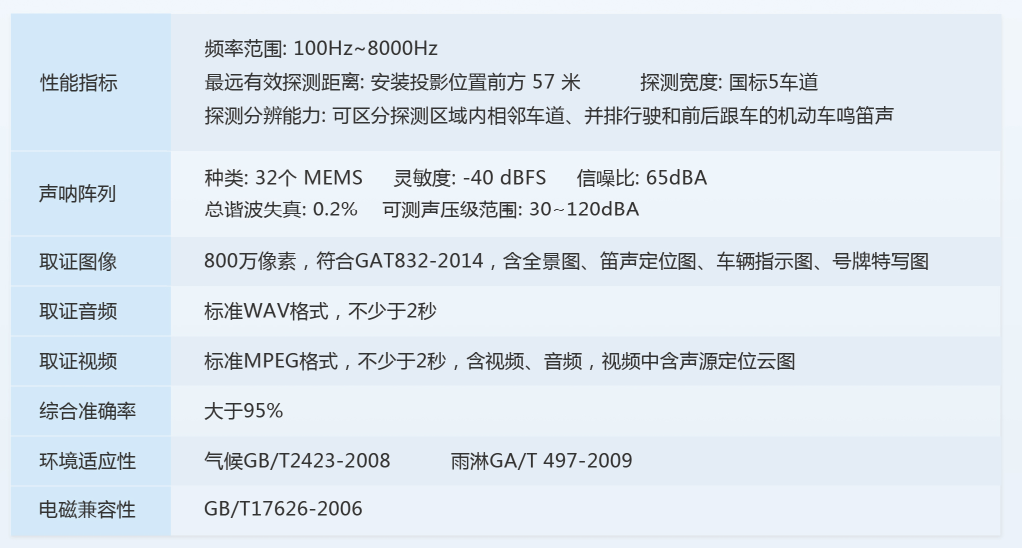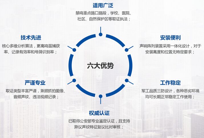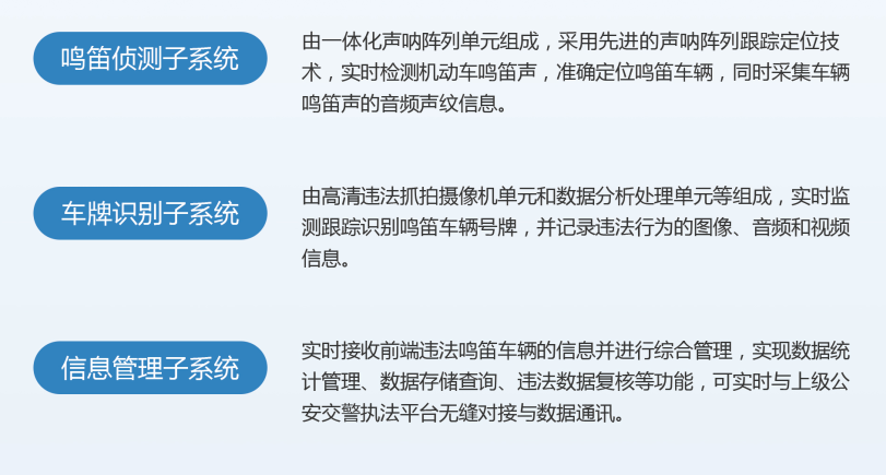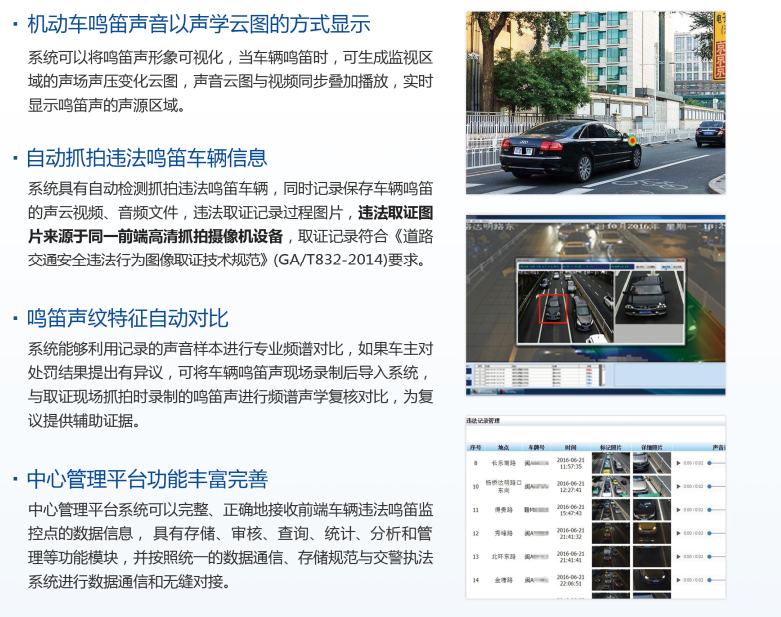 本系统可安装在城市交通禁止鸣笛的区域、路口或路段上,并对监测区域内任意车道内机动车乱鸣笛行为进行不间断自动监测和取证记录。系统通过军工级声呐声纳阵列定位技术准确定位违法鸣笛车辆的精确位置,将机动车鸣笛声音以声学云图的方式标记出鸣笛车辆,有效区分并排和前后车辆的鸣笛行为,并能自动识别鸣笛车辆号牌,同时保存违法鸣笛车辆的抓拍取证图像、违法鸣笛视频段和声纹特征文件,以复核确定违法鸣笛车辆,取证类型丰富,取证效果严谨。