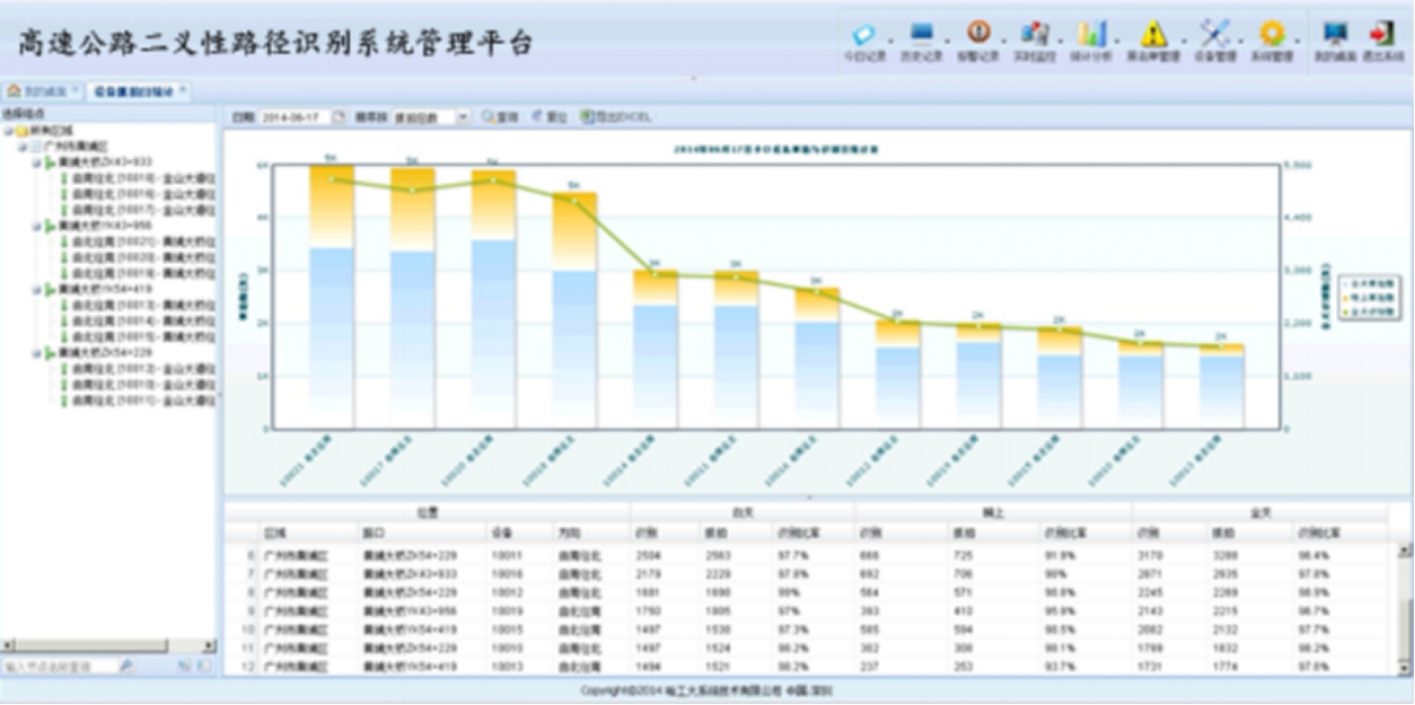 ● 功能强大的路径识别管理平台(基于Oracle11G关系数据库),为收费系统提供准确的行车路径信息,可实时查看通行车辆,识别率和车流量可分地点、分时段查询统计。